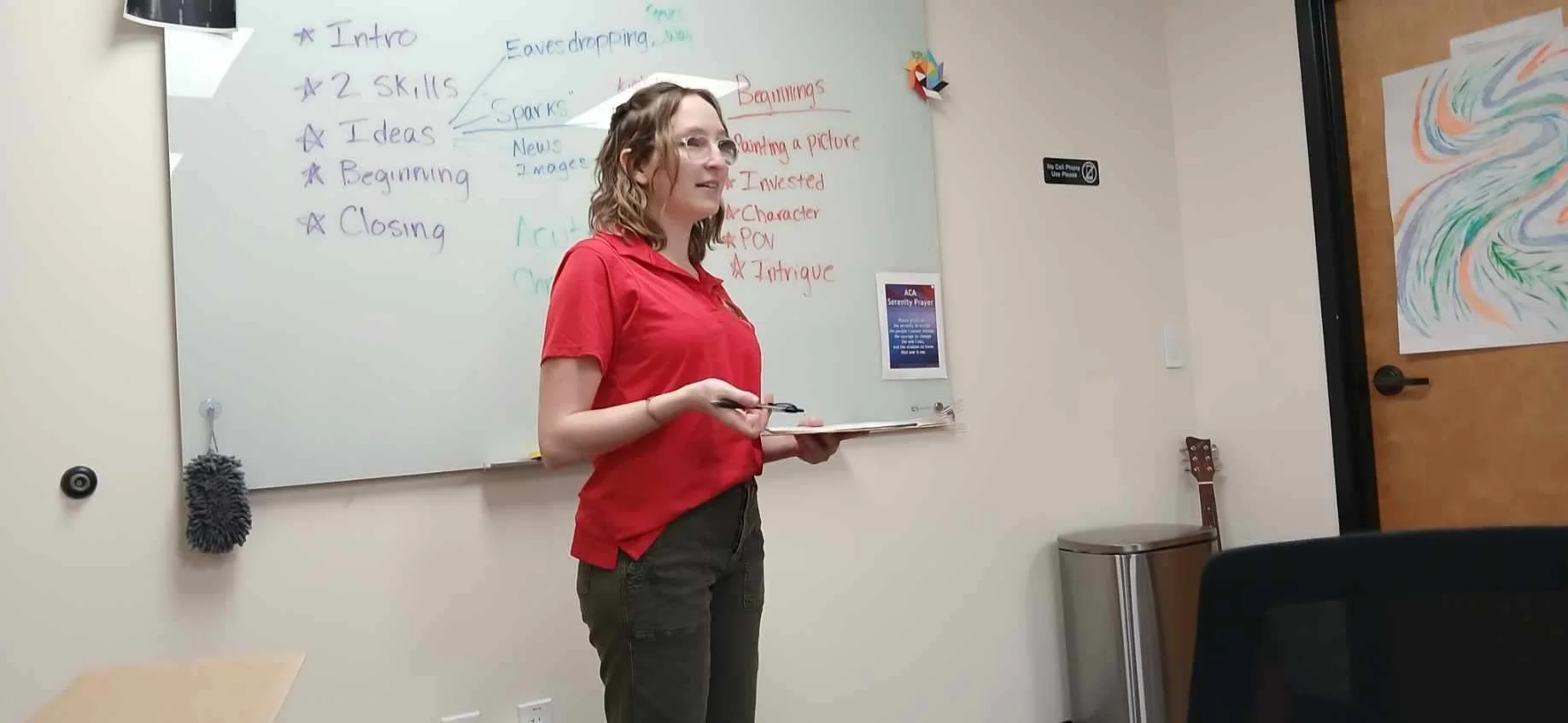 Teaching both in local communities and at the University of South Florida I had the chance to fully develop and understand my approach to curriculum. When I taught introductory fiction courses, I encountered a wide variety of attitudes toward writing, and I knew my lesson plans needed to acknowledge both confident writers and writers who were uncertain. In the classroom, it is most important to me to preserve excitement about writing and learning. For this reason, my lessons center deeper understanding. Rather than teaching definitions or concepts in a lecture format, which centers me as the expert, I prefer to demonstrate learning with students, creating community definitions for concepts. For example, instead of simply stating the difference between scene and summary, I brought in passages with examples of both, letting students name the effect of both. In this approach, the understanding comes from their own noticing.
